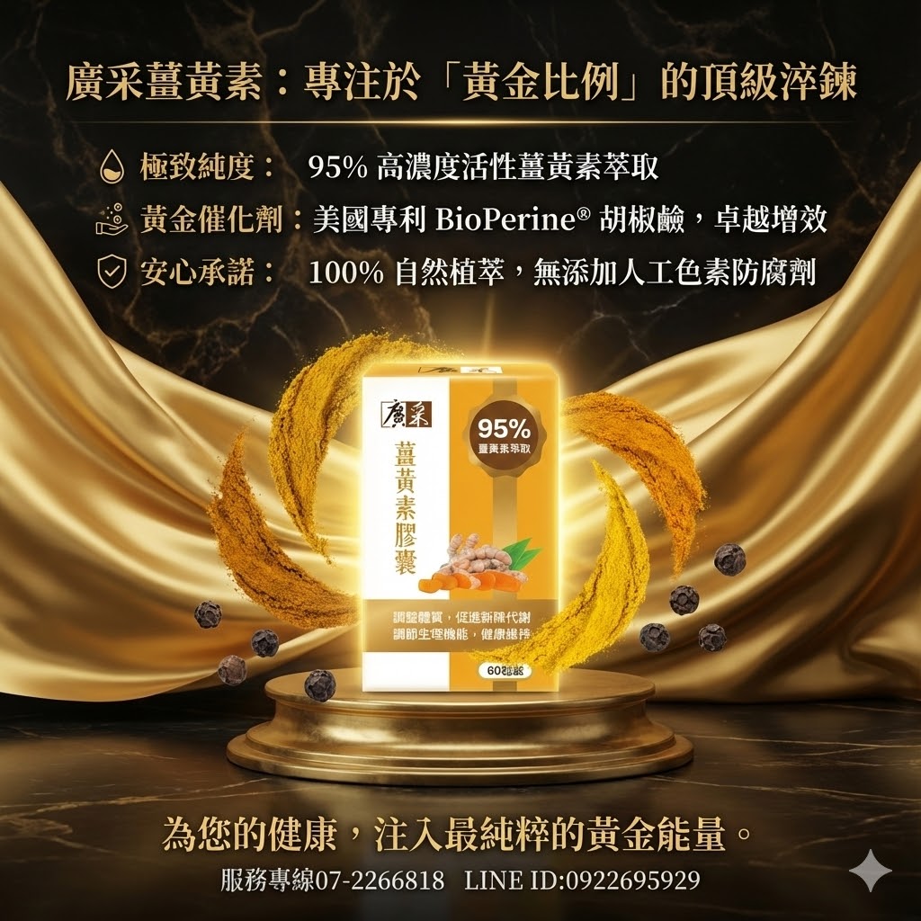 【廣采薑黃素膠囊──95% 極致純度,重新定義「黃金」價值】調整體質、促進新陳代謝、調節生理機能、健康維持。